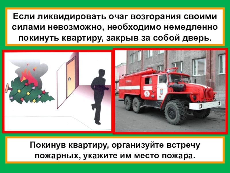 Покинув квартиру, организуйте встречу пожарных, укажите им место пожара.