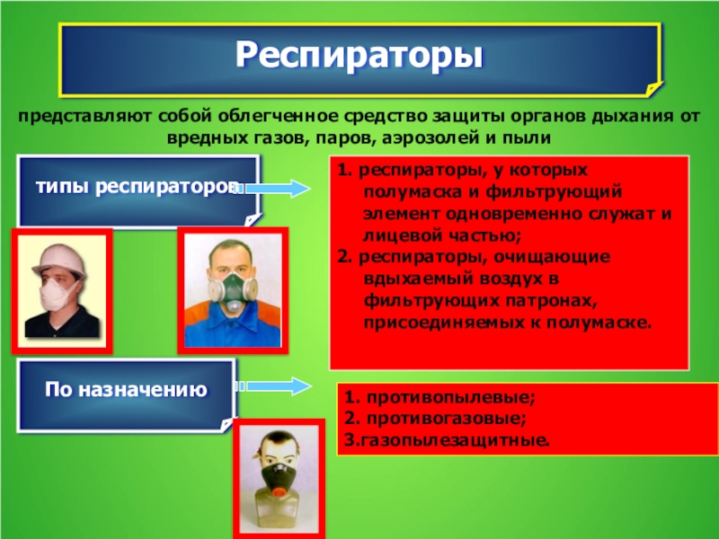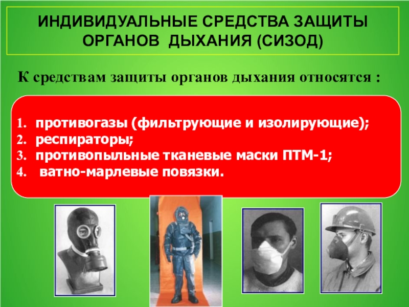 ИНДИВИДУАЛЬНЫЕ СРЕДСТВА ЗАЩИТЫ ОРГАНОВ ДЫХАНИЯ (СИЗОД)К средствам защиты органов дыхания относятся : противогазы (фильтрующие и изолирующие); респираторы;противопыльные