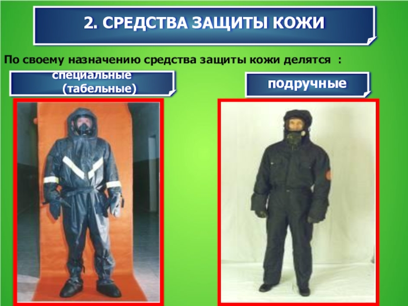 2. СРЕДСТВА ЗАЩИТЫ КОЖИ По своему назначению средства защиты кожи делятся : специальные (табельные) подручные