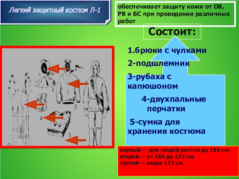 Легкий защитный костюм Л-1 обеспечивает защиту кожи от OB, PB и БС при проведении различных работ Состоит:1.брюки