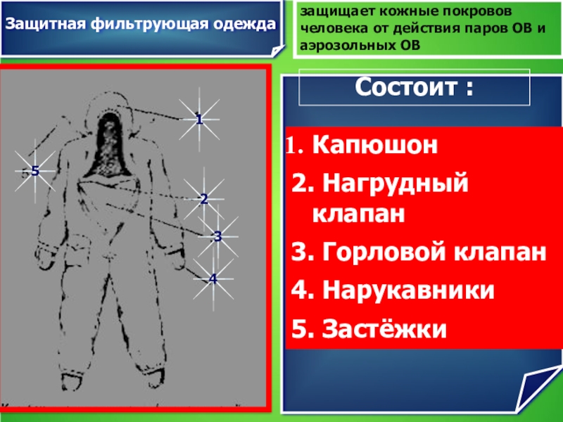 Защитная фильтрующая одеждазащищает кожные покровов человека от действия паров ОВ и аэрозольных ОВ Состоит :Капюшон2. Нагрудный клапан3.