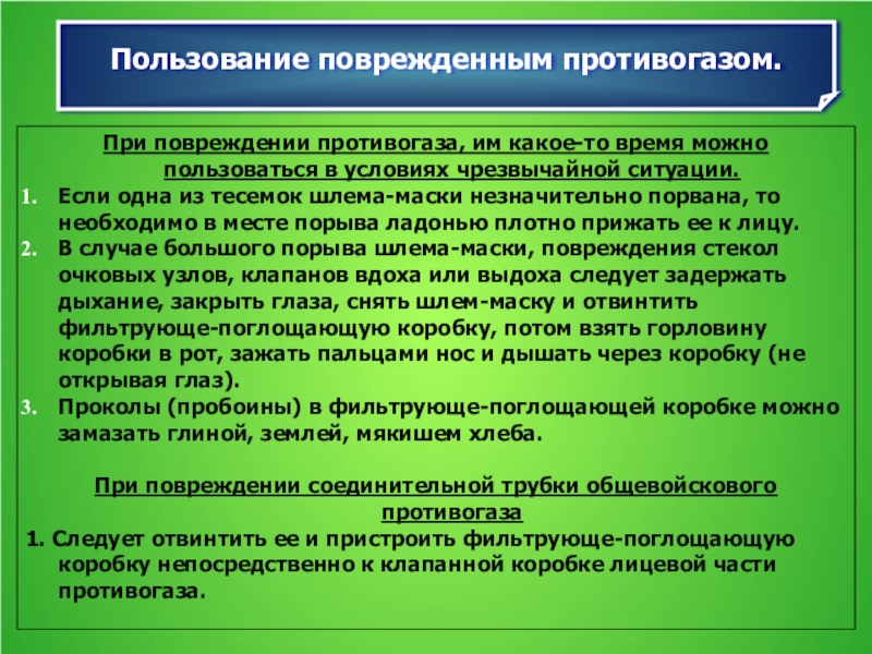 Слайд 9При переводе противогаза в «боевое» положение необходимо :