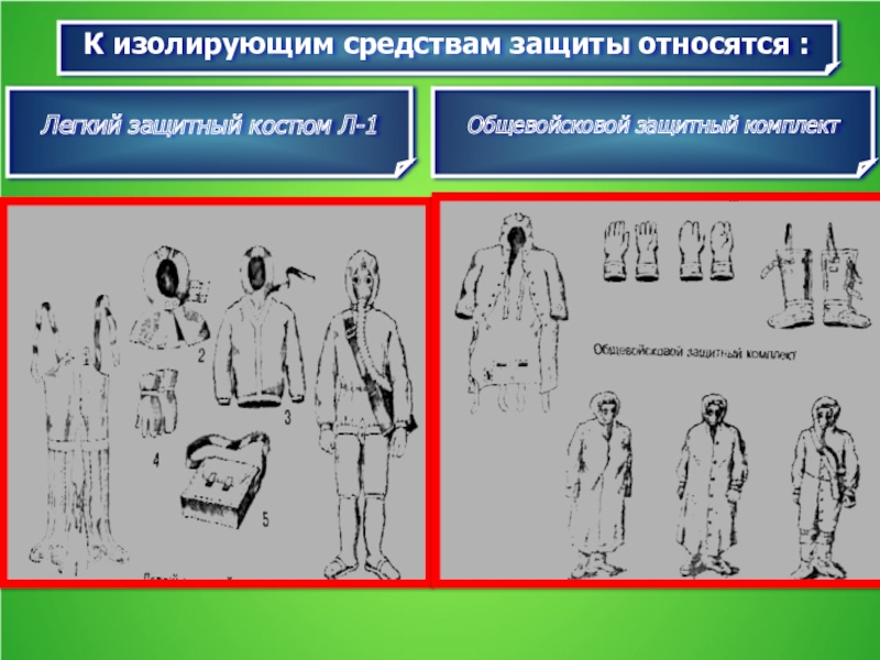 К изолирующим средствам защиты относятся : Легкий защитный костюм Л-1 Общевойсковой защитный комплект