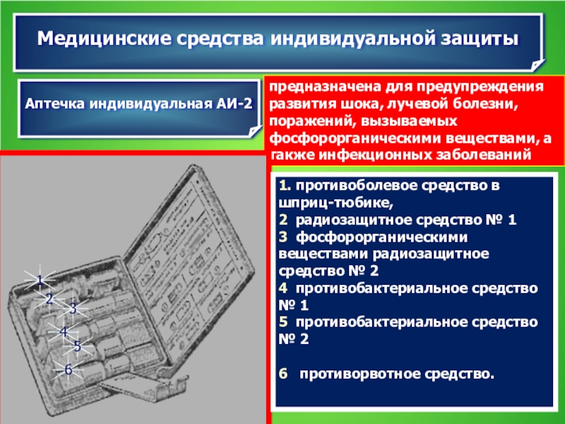 Медицинские средства индивидуальной защитыАптечка индивидуальная АИ-2 предназначена для предупреждения развития шока, лучевой болезни, поражений, вызываемых фосфорорганическими веществами,