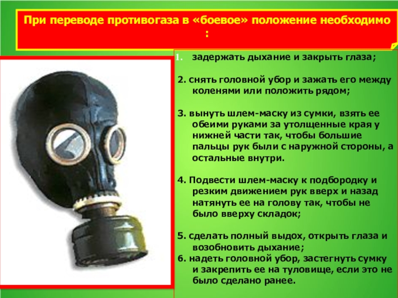 При переводе противогаза в «боевое» положение необходимо :задержать дыхание и закрыть глаза;2. снять головной убор и зажать