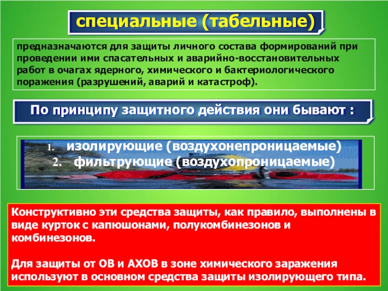 специальные (табельные) предназначаются для защиты личного состава формирований при проведении ими спасательных и аварийно-восстановительных работ в очагах