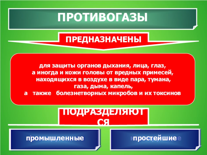 ПРОТИВОГАЗЫПРЕДНАЗНАЧЕНЫдля защиты органов дыхания, лица, глаз, а иногда и кожи головы от вредных примесей, находящихся в воздухе