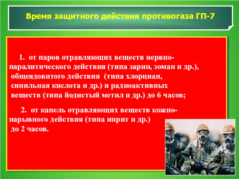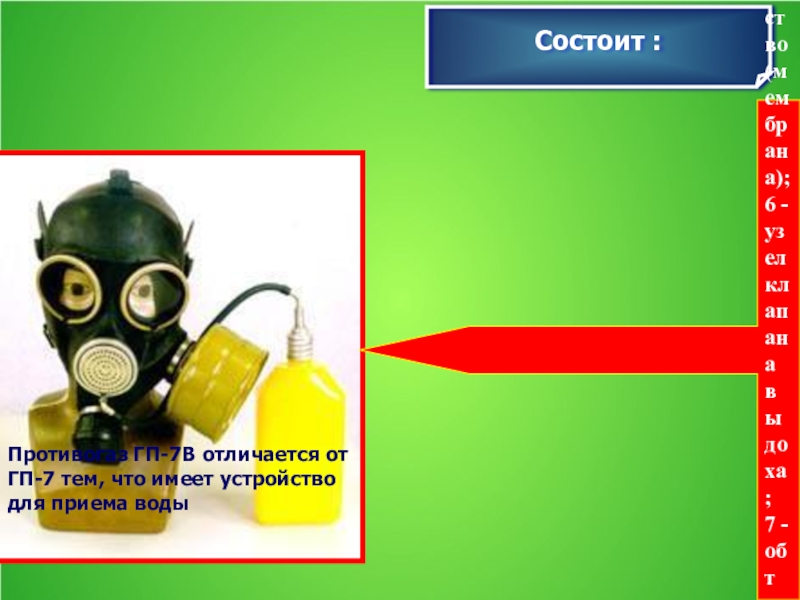 Гражданский противогаз ГП-7Гражданский противогаз ГП-7 предназначендля защиты органов дыхания, глаз и лица человека от отравляющих и радиоактивных