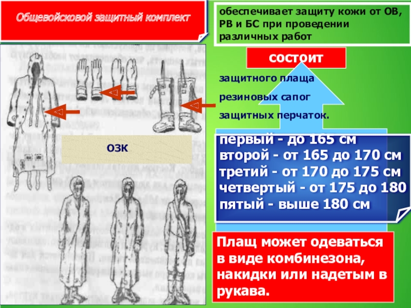 Общевойсковой защитный комплект ОЗКсостоитобеспечивает защиту кожи от OB, PB и БС при проведении различных работ защитного плащарезиновых