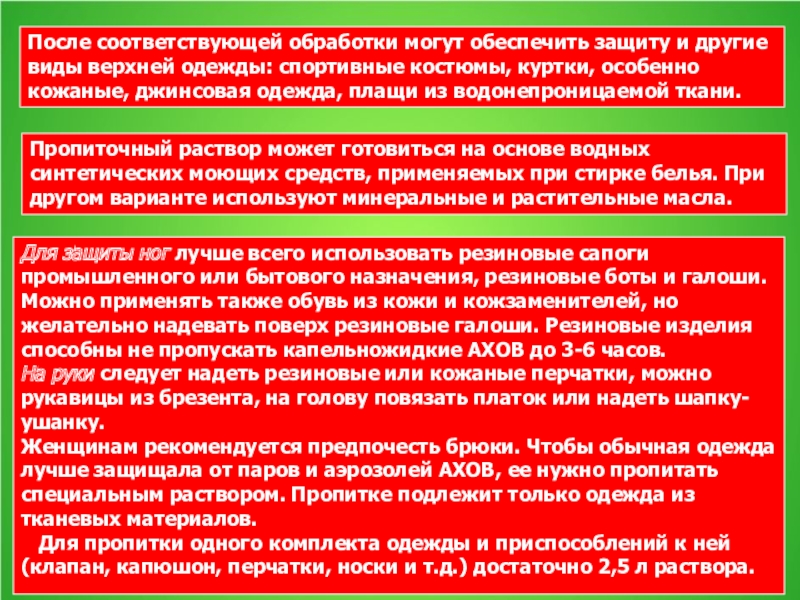Женщинам рекомендуется предпочесть брюки. Чтобы обычная одежда лучше защищала от паров и аэрозолей АХОВ, ее нужно пропитать специальным раствором. Пропитке подлежит только одежда из тканевых материалов.