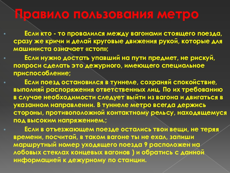 Если поезд остановился в туннеле, сохраняй спокойствие, выполняй распоряжения ответственных лиц. По их требованию в случае необходимости следует выйти из вагона и двигаться в указанном направлении. В туннеле метро всегда держись стороны, противоположной контактному рельсу, находящемуся под высоким напряжением.;