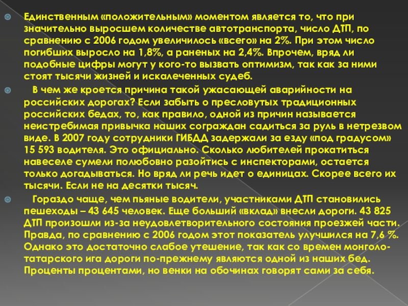 число ДТП, по сравнению с 2006 годом увеличилось «всего» на 2%. При этом число погибших выросло на 1,8%, а раненых на 2,4%. Впрочем, вряд ли подобные цифры могут у кого-то вызвать оптимизм, так как за ними стоят тысячи жизней и искалеченных судеб.