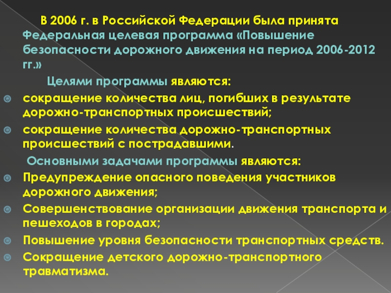 была принята Федеральная целевая программа «Повышение безопасности дорожного движения на период 2006-2012 гг.»