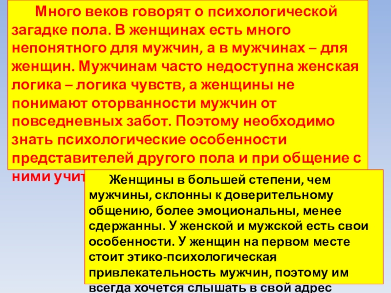 Женщины в большей степени, чем мужчины, склонны к доверительному общению, более эмоциональны, менее сдержанны. У женской и мужской есть свои особенности. У женщин на первом месте стоит этико-психологическая привлекательность мужчин, поэтому им всегда хочется слышать в свой адрес ласковые слова.