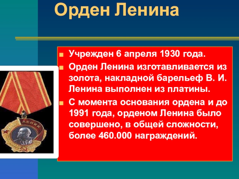 золота, накладной барельеф В. И. Ленина выполнен из платины.