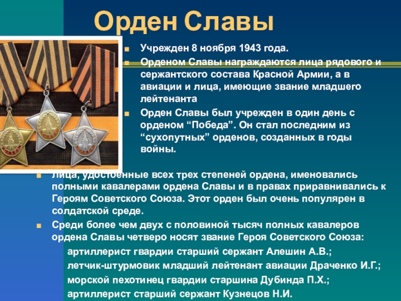 Орден Славы был учрежден в один день с орденом “Победа”. Он стал последним из “сухопутных” орденов, созданных в годы войны.