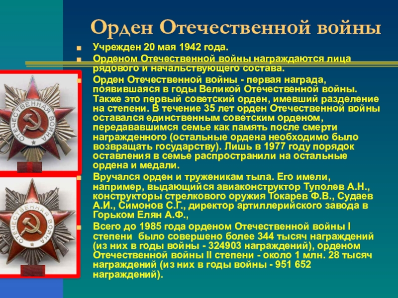 Орден Отечественной войны - первая награда, появившаяся в годы Великой Отечественной войны. Также это первый советский орден, имевший разделение на степени. В течение 35 лет орден Отечественной войны оставался единственным советским орденом, передававшимся семье как память после смерти награжденного (остальные ордена необходимо было возвращать государству). Лишь в 1977 году порядок оставления в семье распространили на остальные ордена и медали.