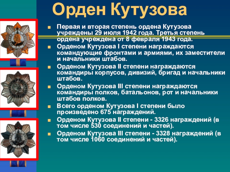 Первая и вторая степень ордена Кутузова учреждены 29 июля 1942