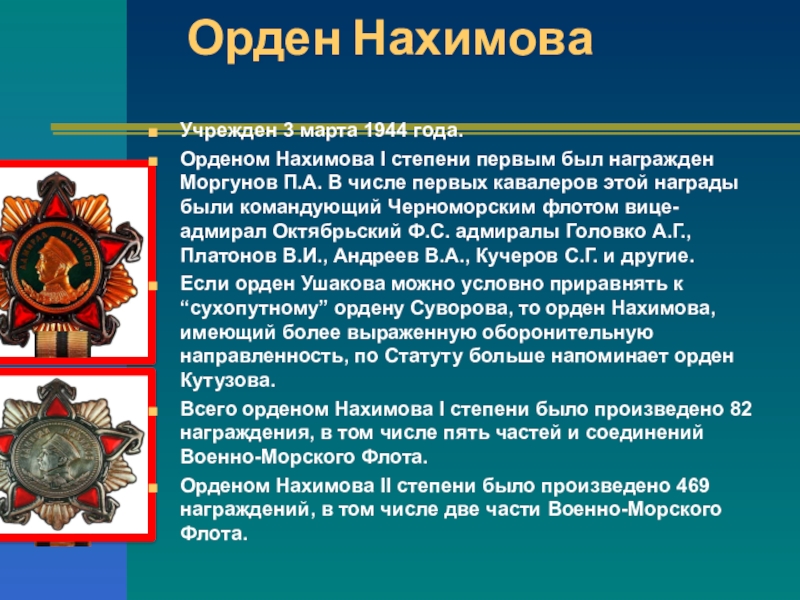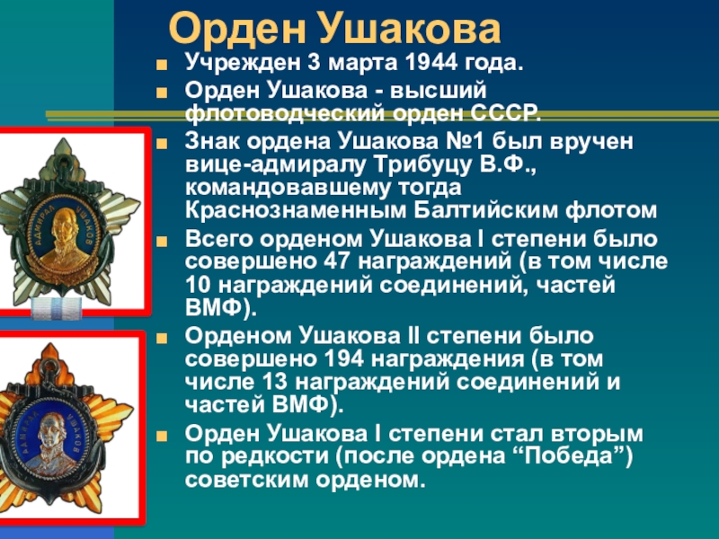 Орден Ушакова I степени стал вторым по редкости (после ордена “Победа”) советским орденом.