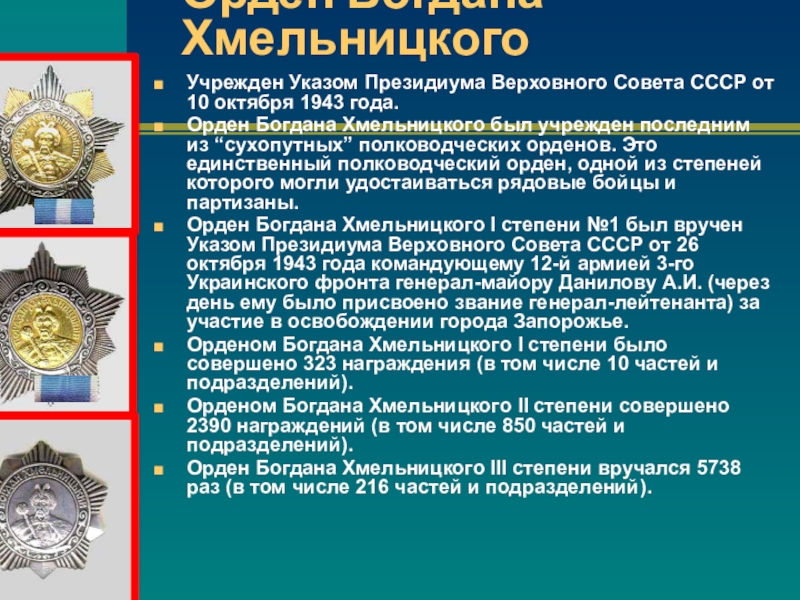 Орден Богдана Хмельницкого был учрежден последним из “сухопутных” полководческих орденов. Это единственный полководческий орден, одной из степеней которого могли удостаиваться рядовые бойцы и партизаны.