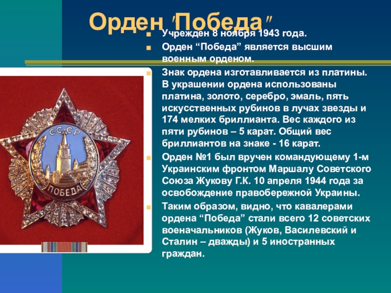 Таким образом, видно, что кавалерами ордена “Победа” стали всего 12 советских военачальников (Жуков, Василевский и Сталин – дважды) и 5 иностранных граждан.