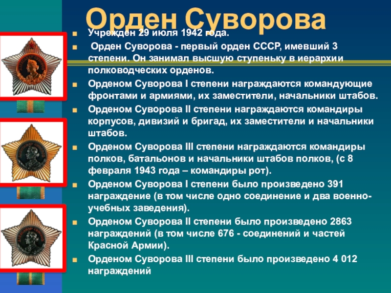 СССР, имевший 3 степени. Он занимал высшую ступеньку в иерархии полководческих орденов.