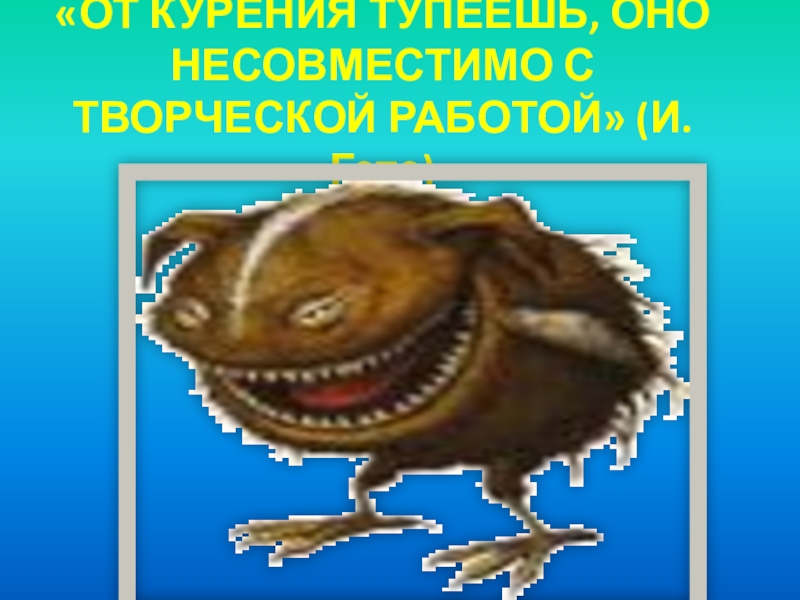 Слайд 30«ОТ КУРЕНИЯ ТУПЕЕШЬ, ОНО НЕСОВМЕСТИМО С ТВОРЧЕСКОЙ РАБОТОЙ» (И.Гете)