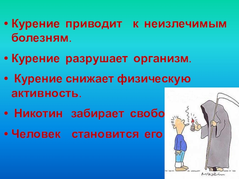Курение приводит  к неизлечимым болезням.Курение разрушает организм. Курение снижает физическую активность. Никотин  забирает свободу.Человек