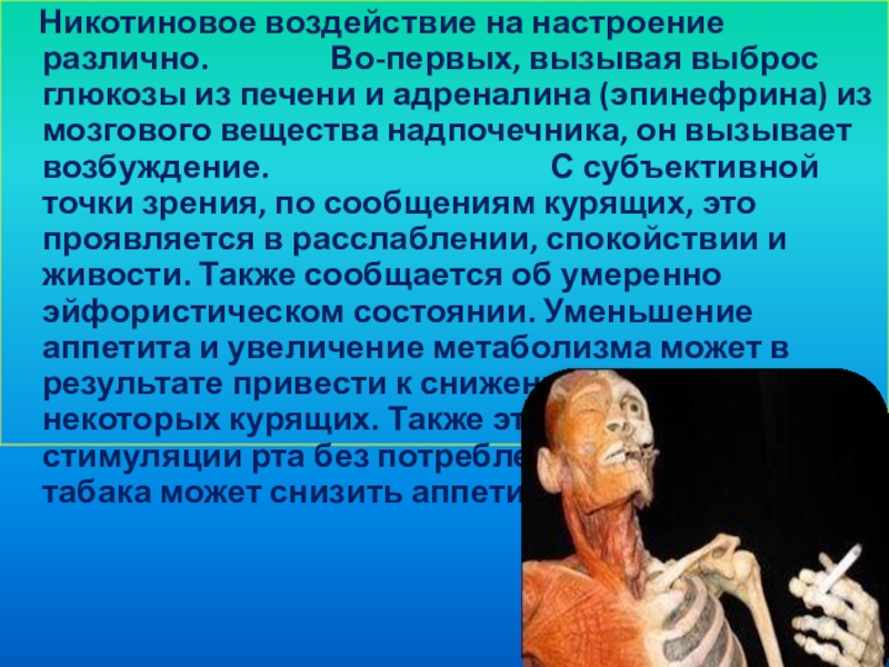 Слайд 18 Никотиновое воздействие на настроение различно.