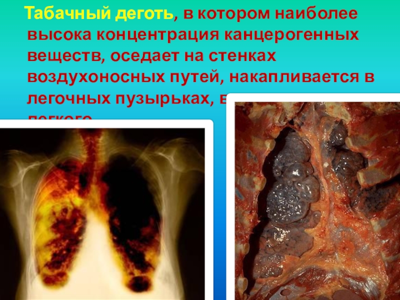 Табачный деготь, в котором наиболее высока концентрация канцерогенных веществ, оседает на стенках воздухоносных путей, накапливается