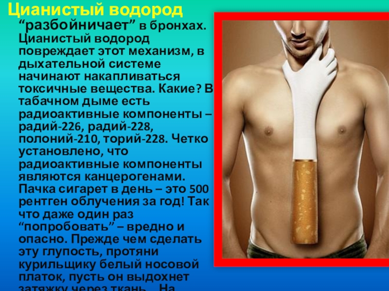 механизм, в дыхательной системе начинают накапливаться токсичные вещества. Какие? В табачном дыме есть радиоактивные компоненты – радий-226, радий-228, полоний-210, торий-228. Четко установлено, что радиоактивные компоненты являются канцерогенами. Пачка сигарет в день – это 500 рентген облучения за год! Так что даже один раз “попробовать” – вредно и опасно. Прежде чем сделать эту глупость, протяни курильщику белый носовой платок, пусть он выдохнет затяжку через ткань. На платке расплывается коричневое пятно.