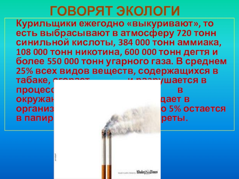 ГОВОРЯТ ЭКОЛОГИ  Курильщики ежегодно «выкуривают», то есть выбрасывают в атмосферу 720 тонн синильной кислоты, 384 000