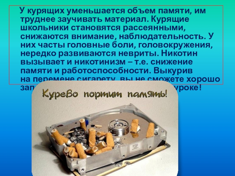 У курящих уменьшается объем памяти, им труднее заучивать материал. Курящие школьники становятся рассеянными, снижаются внимание,
