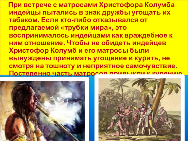 знак дружбы угощать их табаком. Если кто-либо отказывался от предлагаемой «трубки мира», это воспринималось индейцами как враждебное к ним отношение. Чтобы не обидеть индейцев Христофор Колумб и его матросы были вынуждены принимать угощение и курить, не смотря на тошноту и неприятное самочувствие. Постепенно часть матросов привыкли к курению табака.