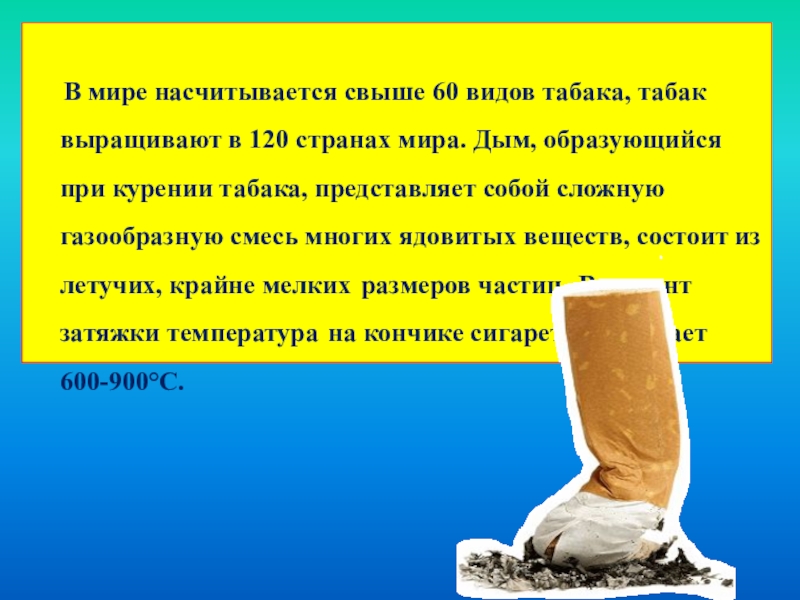 видов табака, табак выращивают в 120 странах мира. Дым, образующийся при курении табака, представляет собой сложную газообразную смесь многих ядовитых веществ, состоит из летучих, крайне мелких размеров частиц. В момент затяжки температура на кончике сигареты достигает 600-900°С.