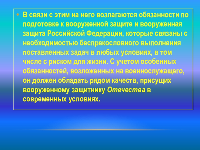 вооруженной защите и вооруженная защита Российской Федерации, которые связаны с необходимостью беспрекословного выполнения поставленных задач в любых условиях, в том числе с риском для жизни. С учетом особенных обязанностей, возложенных на военнослужащего, он должен обладать рядом качеств, присущих вооруженному защитнику Отечества в современных условиях.