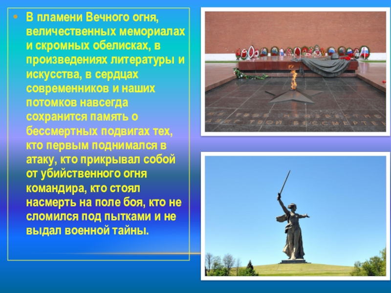 Слайд 6В пламени Вечного огня, величественных мемориалах и скромных обелисках, в произведениях