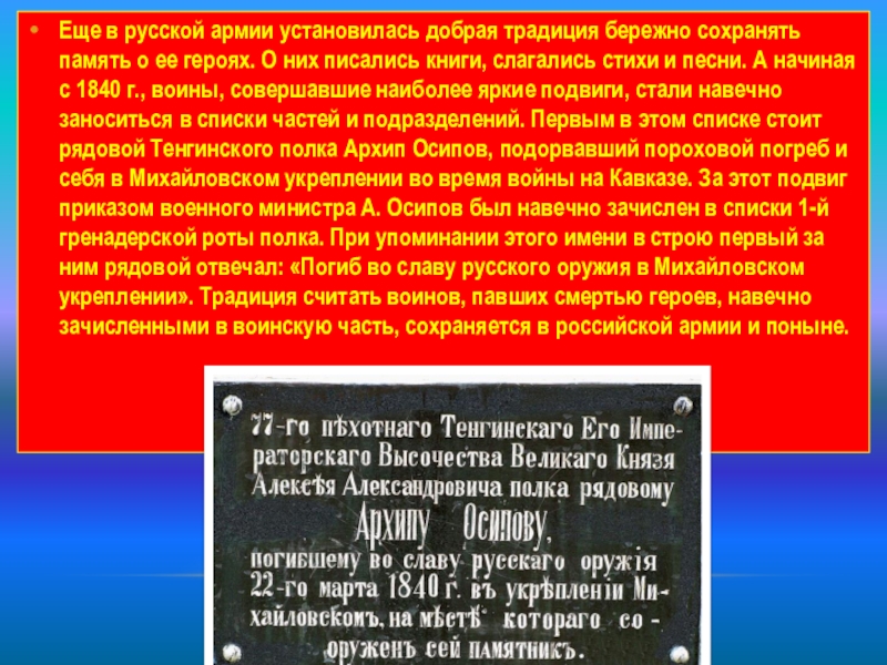 ее героях. О них писались книги, слагались стихи и песни. А начиная с 1840 г., воины, совершавшие наиболее яркие подвиги, стали навечно заноситься в списки частей и подразделений. Первым в этом списке стоит рядовой Тенгинского полка Архип Осипов, подорвавший пороховой погреб и себя в Михайловском укреплении во время войны на Кавказе. За этот подвиг приказом военного министра А. Осипов был навечно зачислен в списки 1-й гренадерской роты полка. При упоминании этого имени в строю первый за ним рядовой отвечал: «Погиб во славу русского оружия в Михайловском укреплении». Традиция считать воинов, павших смертью героев, навечно зачисленными в воинскую часть, сохраняется в российской армии и поныне.