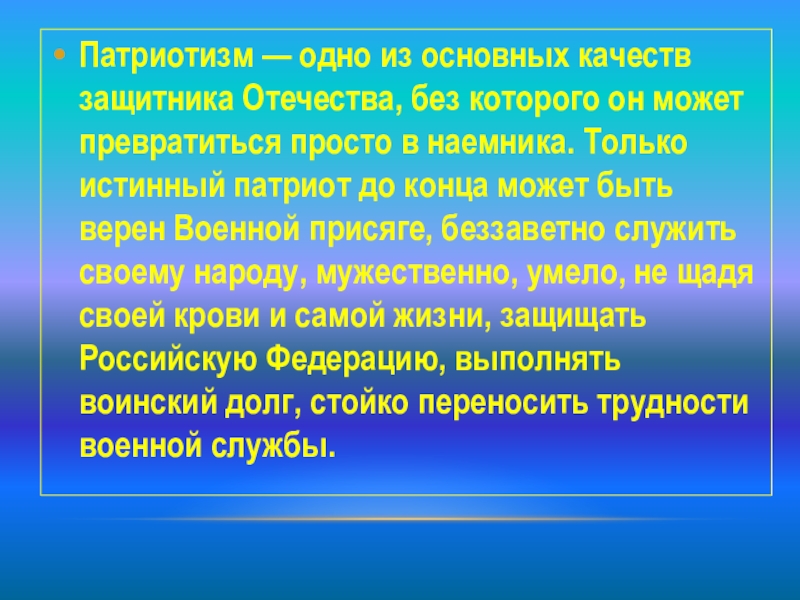 Слайд 7Патриотизм — одно из основных качеств защитника Отечества, без которого он