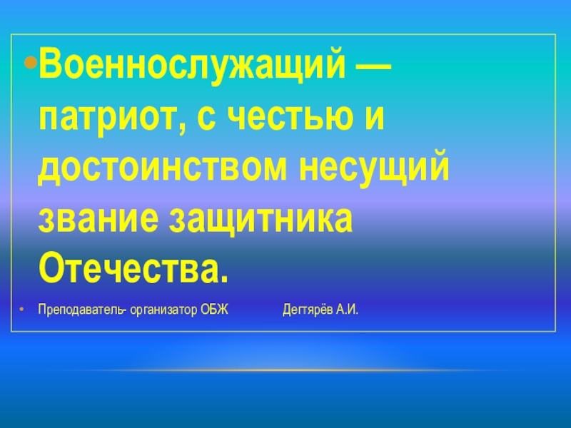Слайд 1Военнослужащий — патриот, с честью и достоинством несущий звание защитника Отечества.