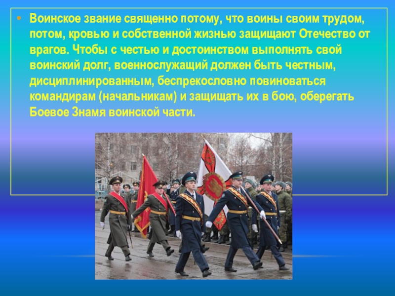 Слайд 11Воинское звание священно потому, что воины своим трудом, потом, кровью и