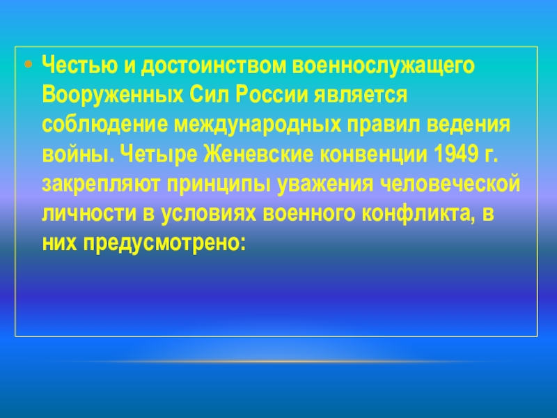 Слайд 9Честью и достоинством военнослужащего Вооруженных Сил России является соблюдение международных правил