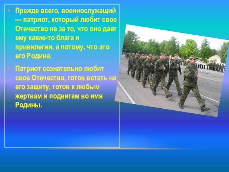 Слайд 3Прежде всего, военнослужащий — патриот, который любит свое Отечество не за