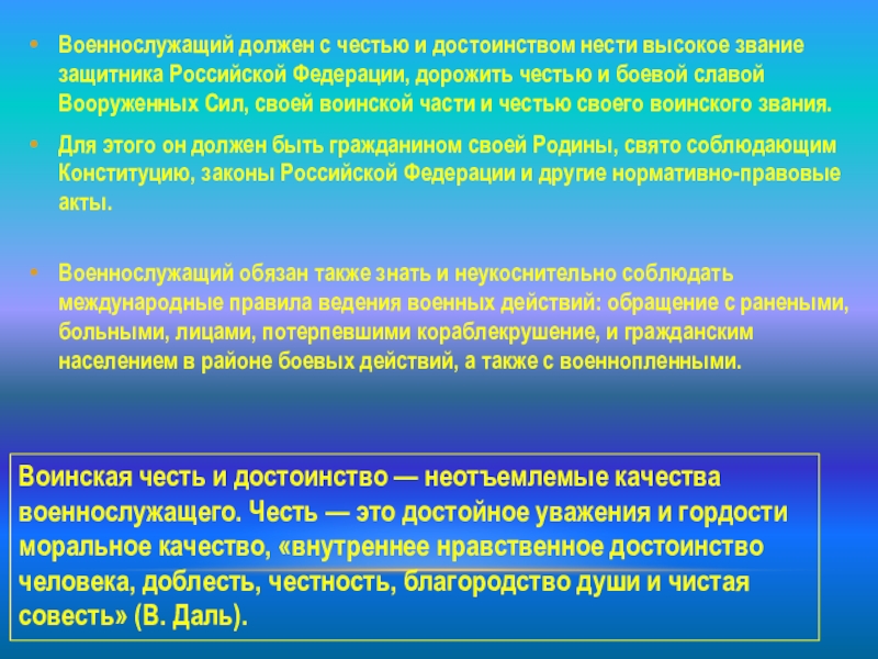 Слайд 8Военнослужащий должен с честью и достоинством нести высокое звание защитника Российской