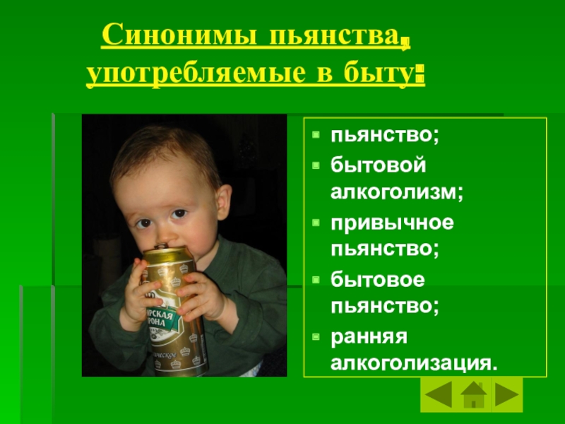 Слайд 9Синонимы пьянства, употребляемые в быту: