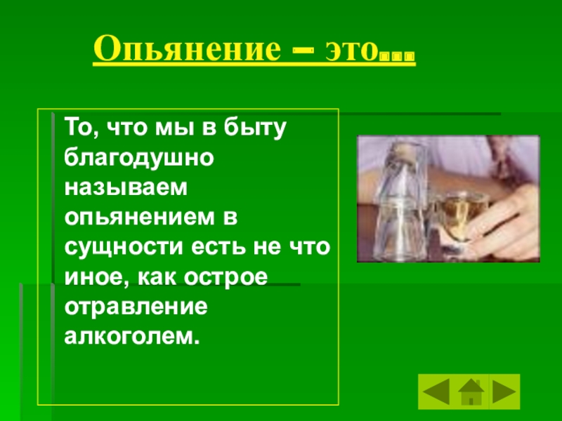 опьянением в сущности есть не что иное, как острое отравление алкоголем.