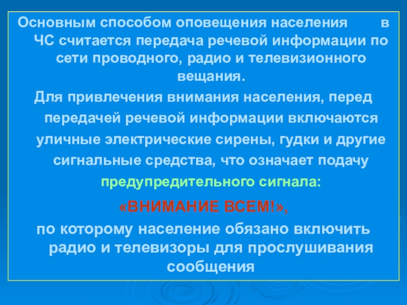 Слайд 6Основным способом оповещения населения в ЧС считается передача