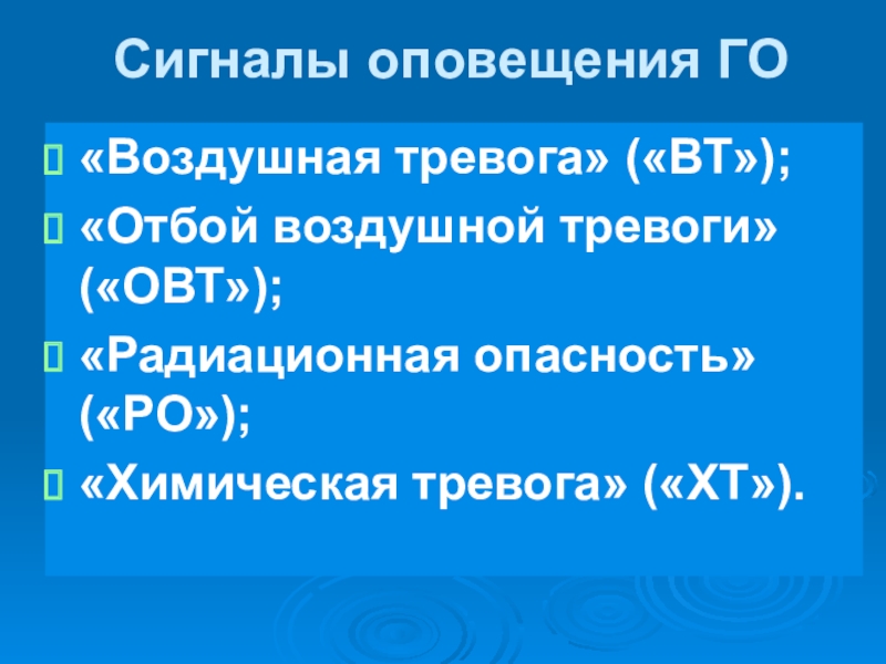 Cигналы оповещения ГО «Воздушная тревога» («ВТ»);«Отбой воздушной тревоги» («ОВТ»);«Радиационная опасность» («РО»);«Химическая тревога» («ХТ»).