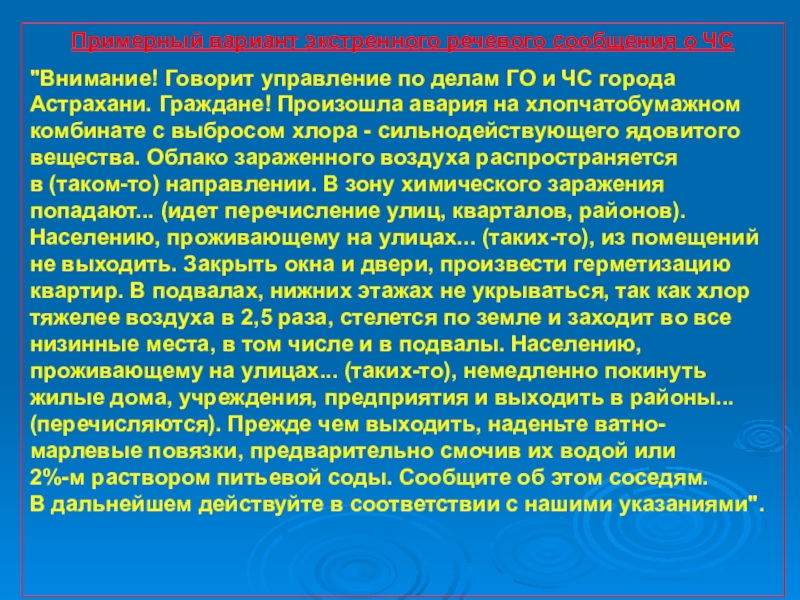 ГО и ЧС города Астрахани. Граждане! Произошла авария на хлопчатобумажном комбинате с выбросом хлора - сильнодействующего ядовитого вещества. Облако зараженного воздуха распространяется в (таком-то) направлении. В зону химического заражения попадают... (идет перечисление улиц, кварталов, районов). Населению, проживающему на улицах... (таких-то), из помещений не выходить. Закрыть окна и двери, произвести герметизацию квартир. В подвалах, нижних этажах не укрываться, так как хлор тяжелее воздуха в 2,5 раза, стелется по земле и заходит во все низинные места, в том числе и в подвалы. Населению, проживающему на улицах... (таких-то), немедленно покинуть жилые дома, учреждения, предприятия и выходить в районы... (перечисляются). Прежде чем выходить, наденьте ватно-марлевые повязки, предварительно смочив их водой или 2%-м раствором питьевой соды. Сообщите об этом соседям. В дальнейшем действуйте в соответствии с нашими указаниями".
