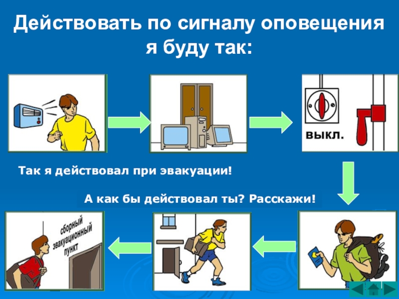 Так я действовал при эвакуации! А как бы действовал ты? Расскажи!Действовать по сигналу оповещения я буду
